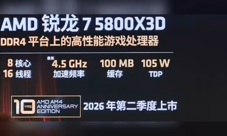 Leaker HXL a diffusé un visuel présenté comme une diapositive promotionnelle d’un AMD Ryzen 7 5800X3D « 10 YRS AMD AM4 Anniversary Edition ». Le document indique un lancement au Q2 2026 et reprend les caractéristiques déjà connues : 8 cœurs, 16 threads, jusqu’à 4,5 GHz en boost, 100 Mo de cache et un TDP de 105 W.