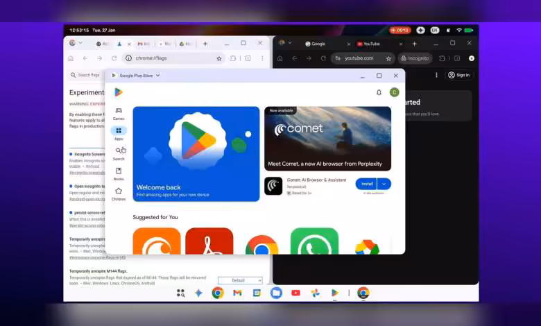Un bouton Extensions apparaît dans la barre d’outils, typique de Chrome desktop plutôt que de l’UI du navigateur Android. Les clips montrent aussi un split-screen avec deux fenêtres Chrome côte à côte, et le Play Store exécuté sur le même système.