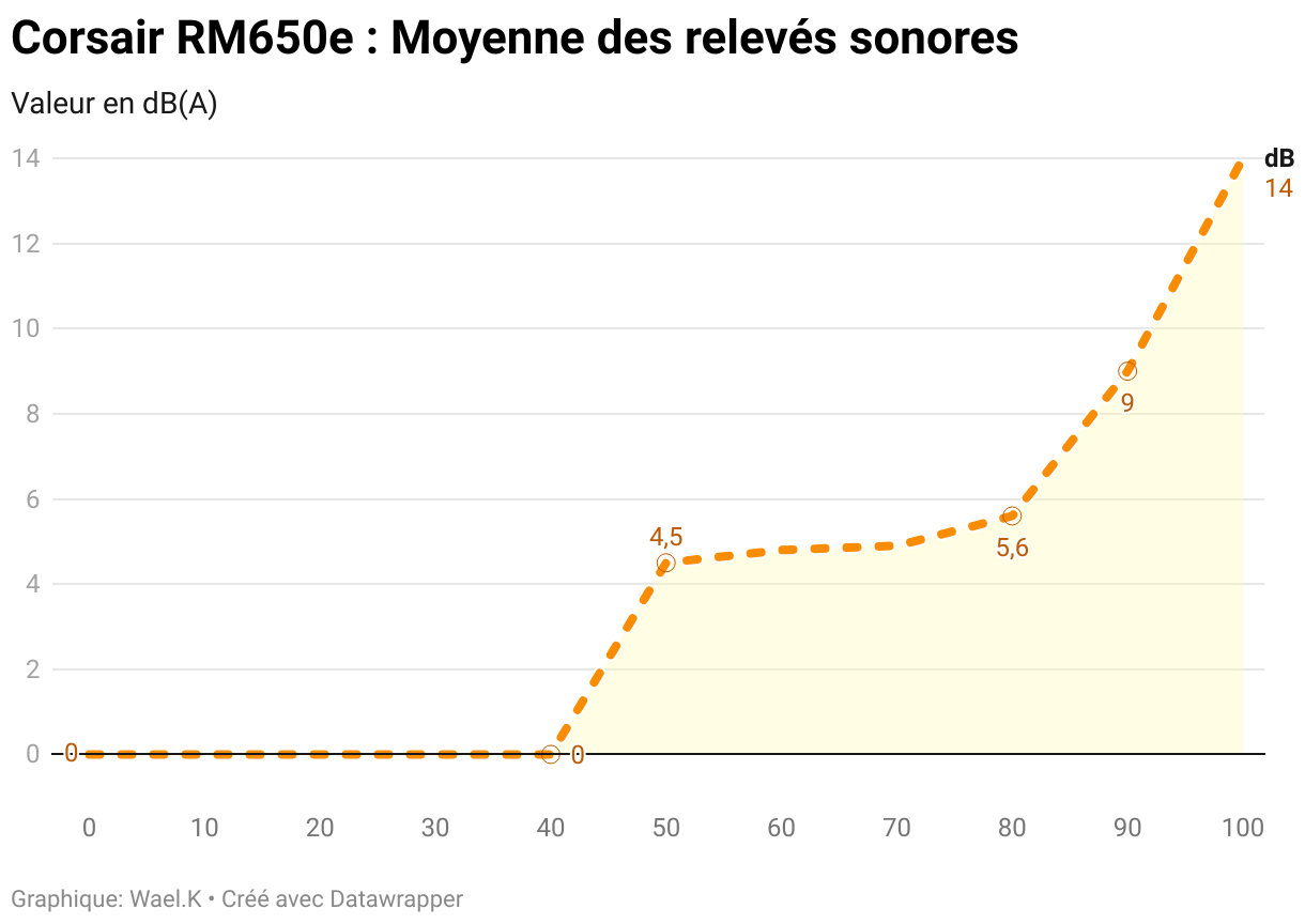 La Corsair RM650e obtient une classification A++ dans le programme Lambda de Cybenetics, avec une moyenne de 14.5 dB(A). Cela la place dans la catégorie des alimentations considérées comme les plus silencieuses. Ce niveau sonore est obtenu grâce au ventilateur de 120 mm à palier rifle et à une courbe de ventilation optimisée.