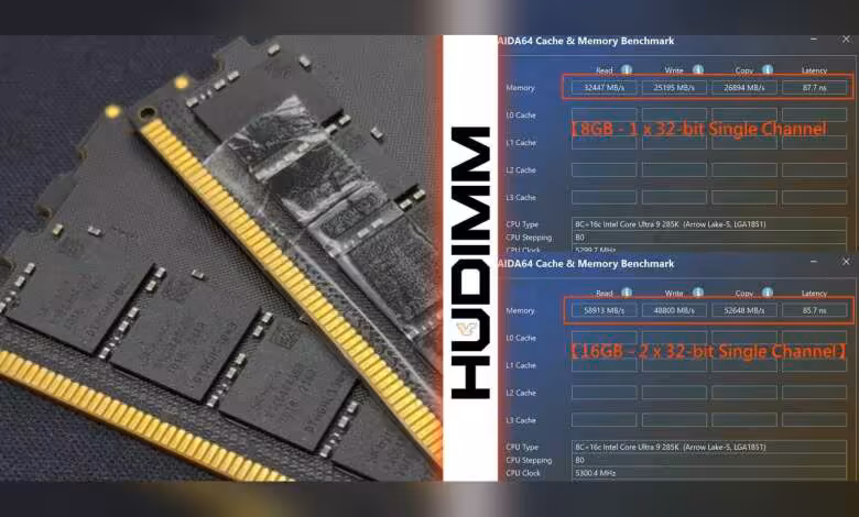 L’autre donnée notable concerne le fonctionnement avec deux modules HUDIMM. D’après HKEPC, deux barrettes HUDIMM en dual-channel offrent à peu près le même niveau qu’une seule DDR5 classique : la configuration « 16GB, 1 x 32-bit dual channel » atteint environ 58,9 Go/s en lecture, soit quasiment le même résultat que la configuration « 16GB, 2 x 32-bit single channel » obtenue avec une barrette non modifiée.