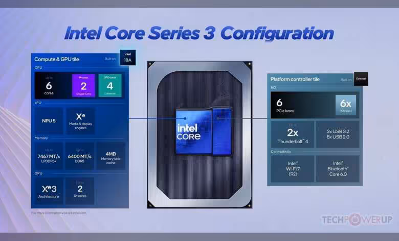 Cette version sert de pilote de lancement pour les Intel Core Series 3 avec GPU intégré, nom de code Wildcat Lake. La gamme, officialisée hier, peut monter jusqu’à six cœurs CPU et deux cœurs GPU Xe3, avec un déploiement attendu dans plus de 70 designs de PC portables.