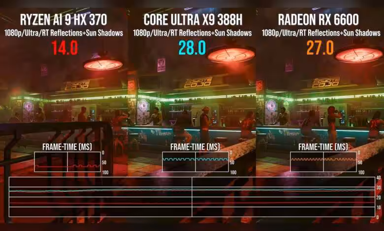 Intel Panther Lake prend l’avantage. À 1080p Ultra avec ombres et reflets ray tracing activés dans Cyberpunk 2077, le Core Ultra X9 388H pointe à 28 FPS, soit deux fois le score du Ryzen AI 9 HX 370 « Strix Point » et sa Radeon 890M à 14 FPS.
