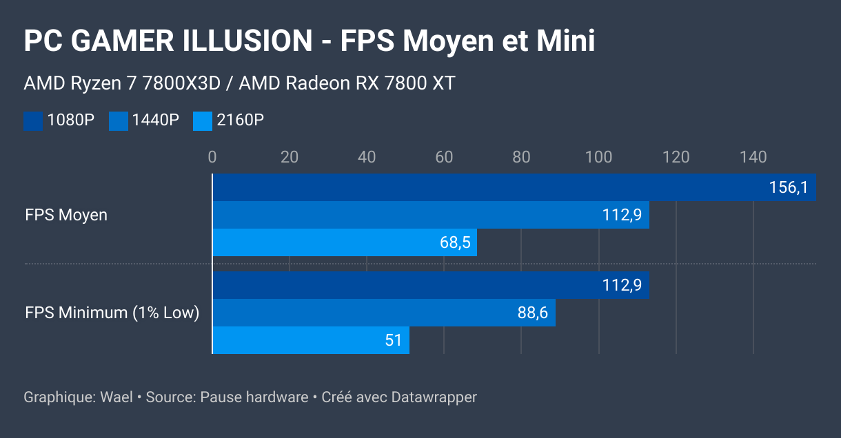Comme vous pourrez le constater, les chiffres parlent d’eux-mêmes avec le PC GAMER ILLUSION By Infomax. Vous pouvez profiter de tous les jeux actuels en qualité ultra, atteignant plus de 150 FPS en 1080p, plus de 110 FPS en 1440p et plus de 65 FPS en 2160p ! Le combo Ryzen 7 7800X3D et Radeon RX 7800 XT fait des merveilles.