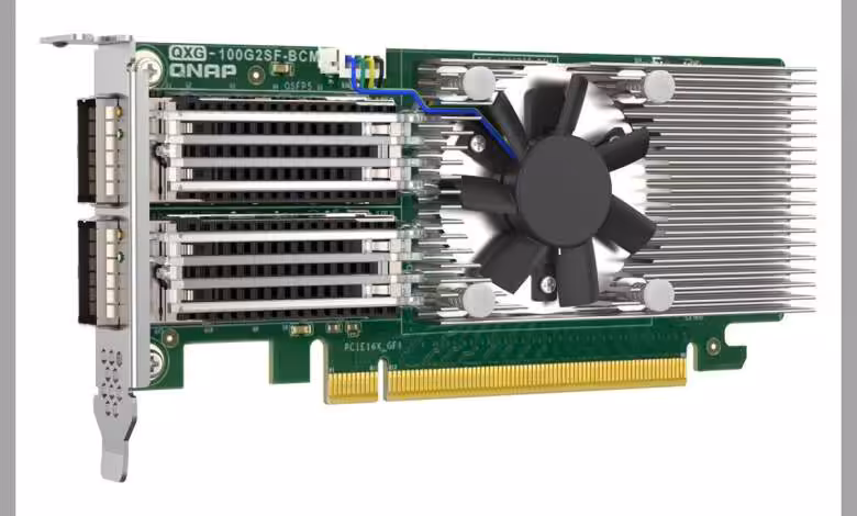 QXG-100G2SF-BCM en vue : QNAP met sur le marché une carte réseau 100 GbE à deux ports pensée pour éliminer les goulots d’étranglement en virtualisation et dans les environnements I/O intensifs. La carte vise clairement les baies tout-flash de la marque et les data centers en quête de coûts CPU réduits et de latence minimale.