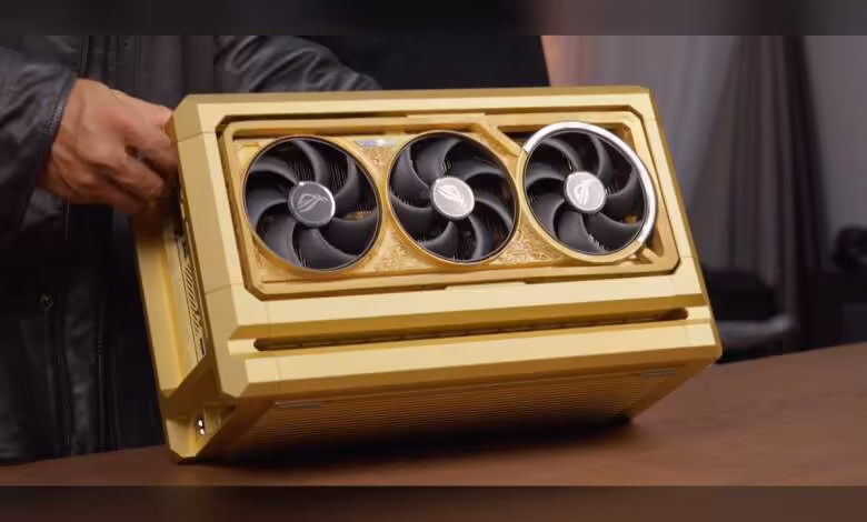 ASUS a présenté la ROG Astral Real Gold Edition à Bilibili World 2025, évolution directe de la ROG Astral Dhahab Edition. Là où la Dhahab n’utilisait que 6,5 g d’or 999, cette version a reçu environ 5 kg d’or pour un poids total d’environ 7,2 kg au lancement.