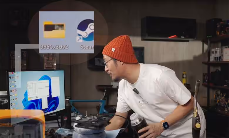 La dernière pièce du puzzle vient d’ASUS. Dans une vidéo d’overclocking du Ryzen 7 9850X3D par Tony Yu (ASUS Chine), un dossier bureautique « 9950x3dv2 » est visible. Cela implique des tests en cours côté ASUS, et donc la disponibilité de matériel ou de microcodes liés à un CPU double 3D V-Cache.
