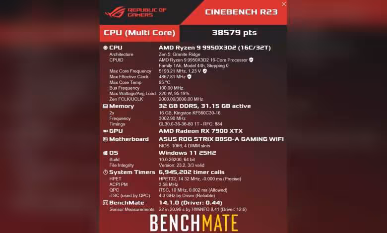 Le système semble s’appuyer sur une carte mère ASUS ROG STRIX B850-A GAMING WIFI, 32 Go de DDR5-6000 signés Kingston, une Radeon RX 7900 XTX et Windows 11 25H2. CPU-Z indique aussi un TDP de 200 W, en phase avec les spécifications déjà publiées par AMD.