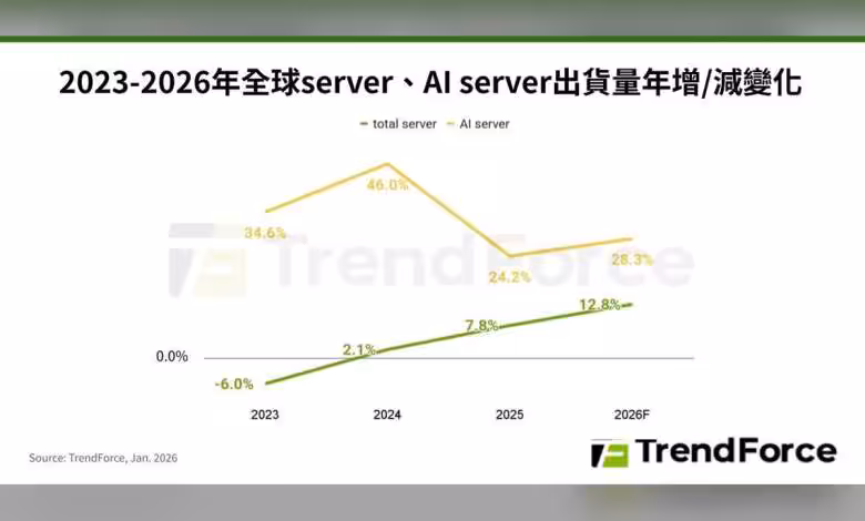 TrendForce anticipe une accélération nette du marché serveurs en 2026 : les livraisons mondiales de machines dédiées à l’IA progresseraient de 28,3% sur un an, tandis que l’ensemble du parc serveurs, incluant les plateformes généralistes, grimperait de 12,8%, une hausse plus marquée qu’en 2025. Le centre de gravité se déplace des charges d’entraînement vers l’inférence, ce qui ouvre de nouveaux volumes pour les serveurs classiques, parallèlement au démarrage d’un cycle de renouvellement.