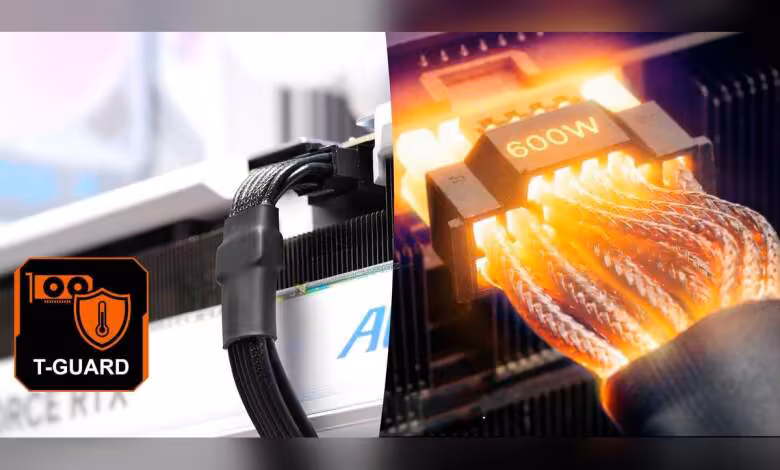 GIGABYTE cite plusieurs causes classiques de surchauffe : insertion incomplète, courbure trop marquée près de la prise, adaptateurs tiers et fatigue thermique sur la durée. C’est précisément sur cette zone que les GPU haut de gamme peuvent faire passer jusqu’à 600 W via un seul câble 16 broches.