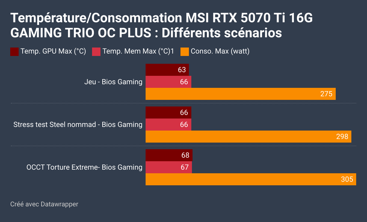 Malgré une consommation modérée, les températures de la RTX 5070 Ti 16G Gaming Trio OC Plus peuvent paraître légèrement élevées par rapport à certaines cartes concurrentes. En effet, même si la consommation en jeu est limitée à 275 W, et atteint un maximum de 305 W en stress test, les températures restent dans une plage acceptable : 63°C en jeu, 66°C en stress test Steel Nomad, et 68°C en OCCT Torture Extreme.