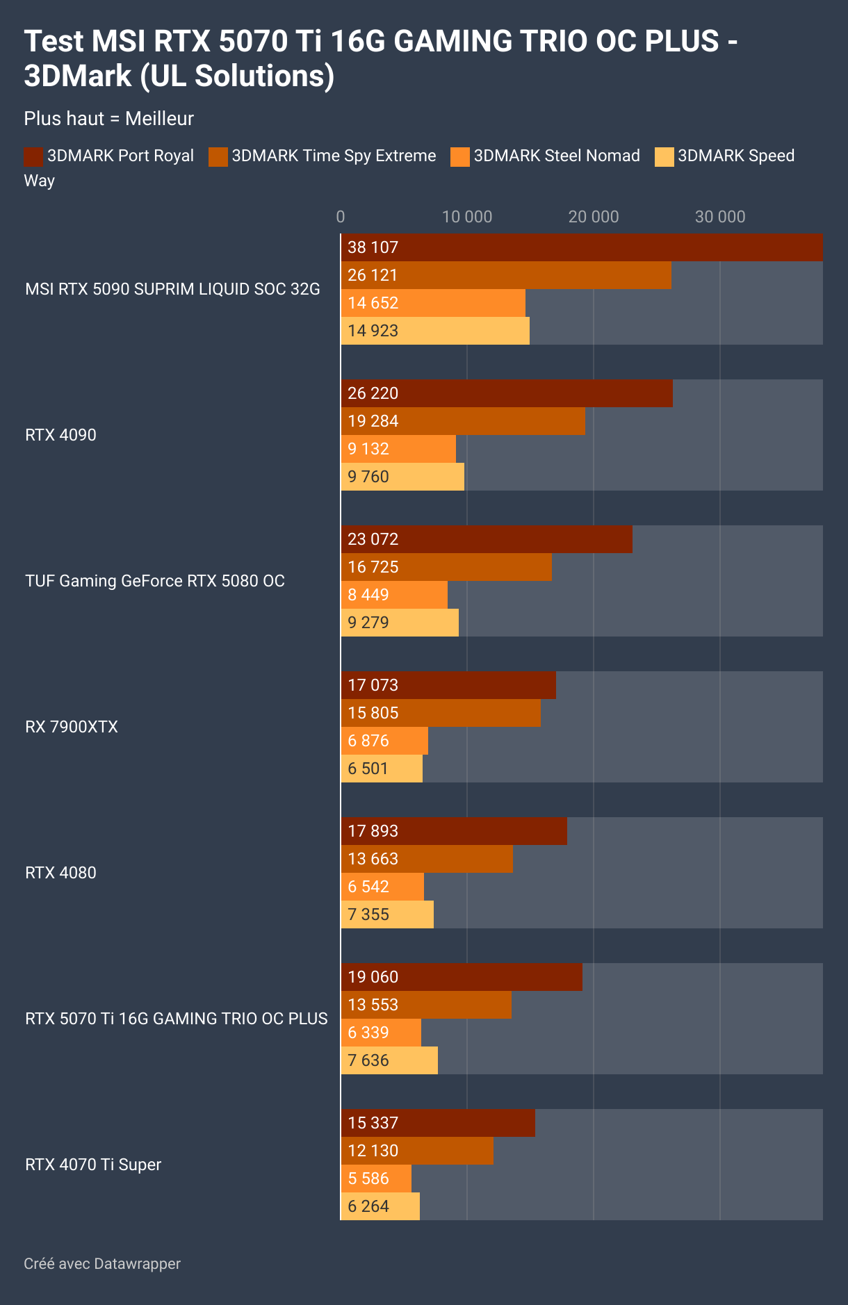 Dans le test 3DMark Port Royal, la RTX 5070 Ti profite clairement de sa nouvelle architecture et de ses optimisations logicielles pour surperformer des cartes comme la RTX 4080 et la RX 7900 XTX.