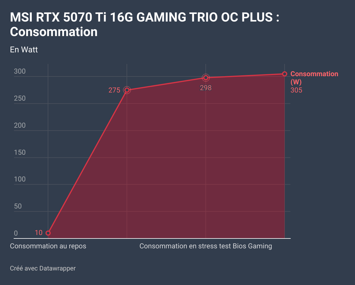 Lors des tests de stress (mode BIOS Gaming), la consommation monte à 298 W, avec des pics possibles allant jusqu’à 305 W, ce qui correspond à une demande maximale sous pleine charge. Cette consommation reste dans des limites acceptables pour une carte graphique de cette performance. En résumé, la consommation de la RTX 5070 Ti est bien maîtrisée, notamment en jeu.