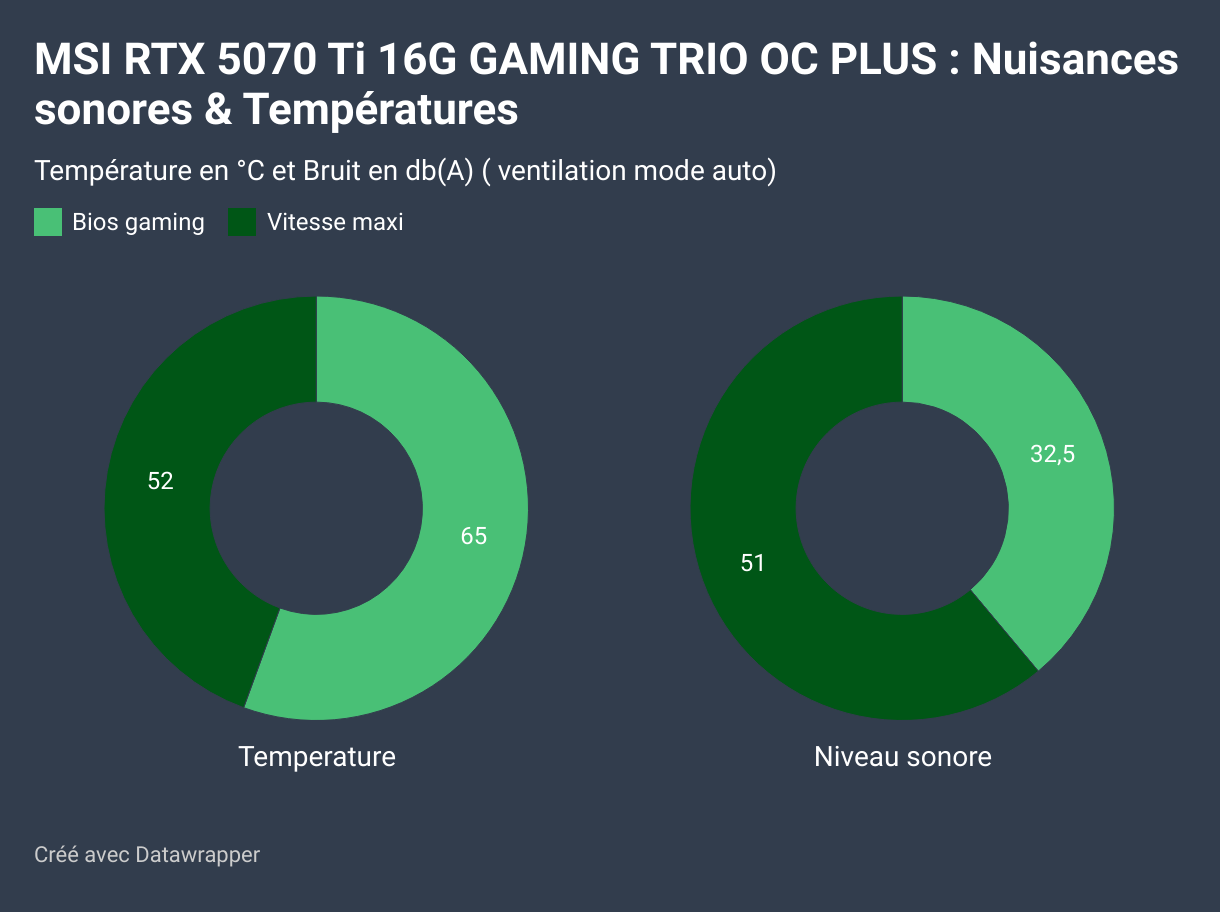 En mode gaming avec ventilation auto, la RTX 5070 Ti 16G Gaming Trio OC Plus reste pratiquement inaudible pendant le jeu, avec un niveau sonore de seulement 32,5 dB(A). Ce niveau est particulièrement bas, permettant une expérience de jeu presque silencieuse, même sous des charges plus lourdes.