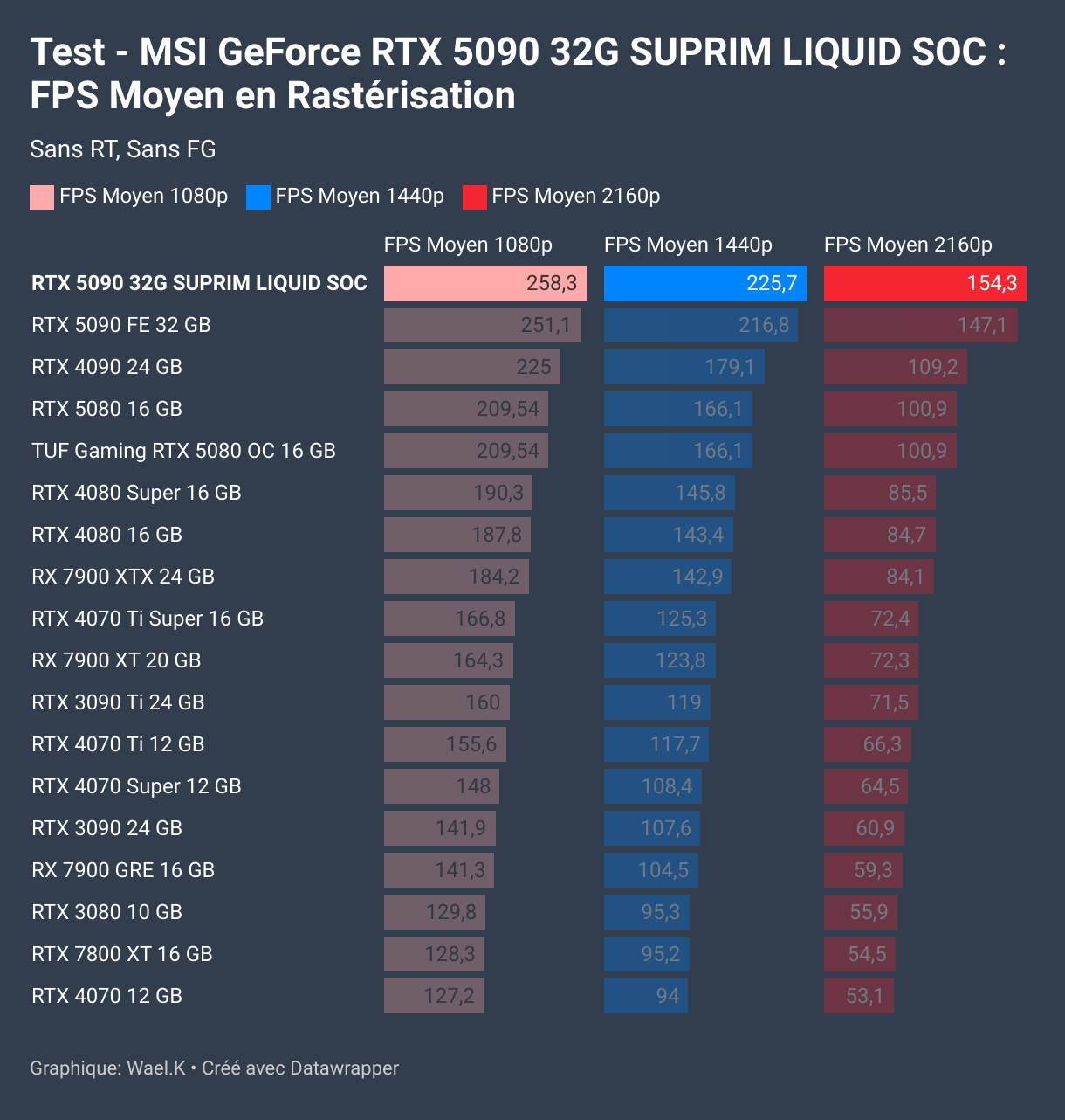 En 4K (2160p) avec 154,3 FPS, elle distance la RTX 5090 FE (147,1 FPS) et creuse un écart massif avec la RTX 5080 FE (100,9 FPS), qui commence à atteindre ses limites.