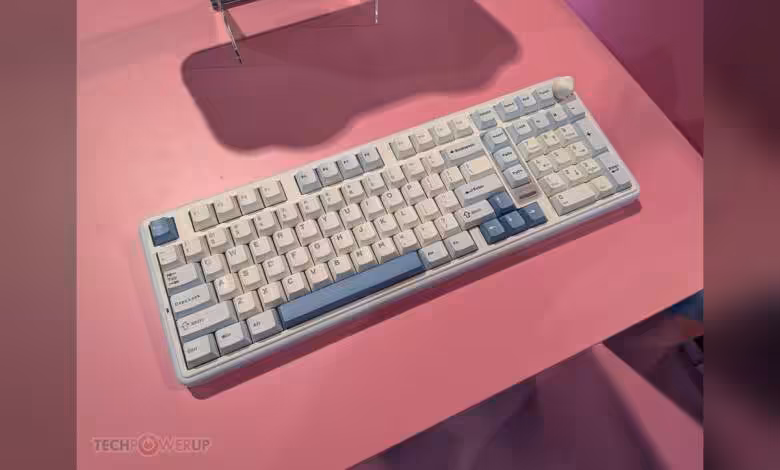 Yunzii exposait aussi le QL75, un clavier mécanique inspiré des machines à écrire dans un format 75 % avec commandes multimédias dédiées. Plus décalé, le C75 Cake Cat Keyboard pousse l’esthétique féline avec éclairage latéral, pieds en forme de patte et un dongle 2,4 GHz dissimulé dans un poisson. On note aussi une plaque arrière façon candy cane et des touches agrémentées de motifs floraux roses. Un design clivant assumé, à prendre ou à laisser.